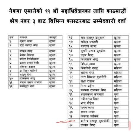मङ्सिर २७ गते देखि हुने महाधिवेसनमा काठमाण्डौ क्षेत्र नं ३ बाट प्रतिनिधि बन्नका लागि क्षेत्र नं ३ का खुल्ला, महिला र युवा बेग्लाबेग्लै क्लस्टरबाट उम्मेदवारी दर्ता भएको छ ।