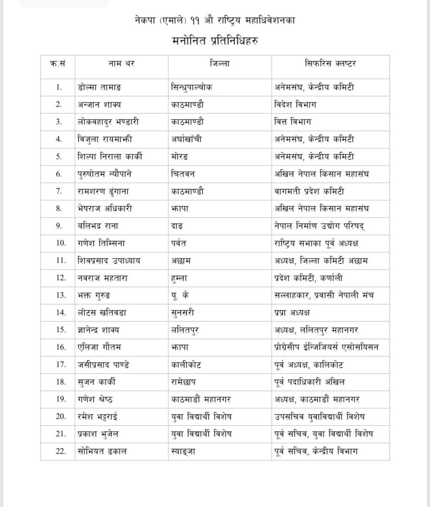 नेकपा एमालेको महाधिवेशन प्रतिनिधिमा को को भए मनोनीत ? (सुची सहित) २७ मंसिर २०८२, शनिबार कपन अनलाइन काठमाडौं , मंसिर २७। नेकपा एमालेले १०८ जनालाई महाधिवेशन प्रतिनिधिमा मनोनीत गरेको छ। को को भए ? तपाइँको प्रतिक्रिया ।