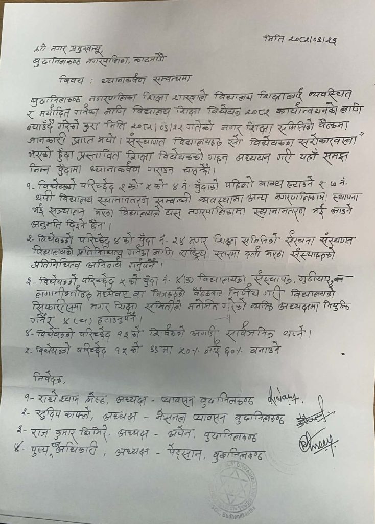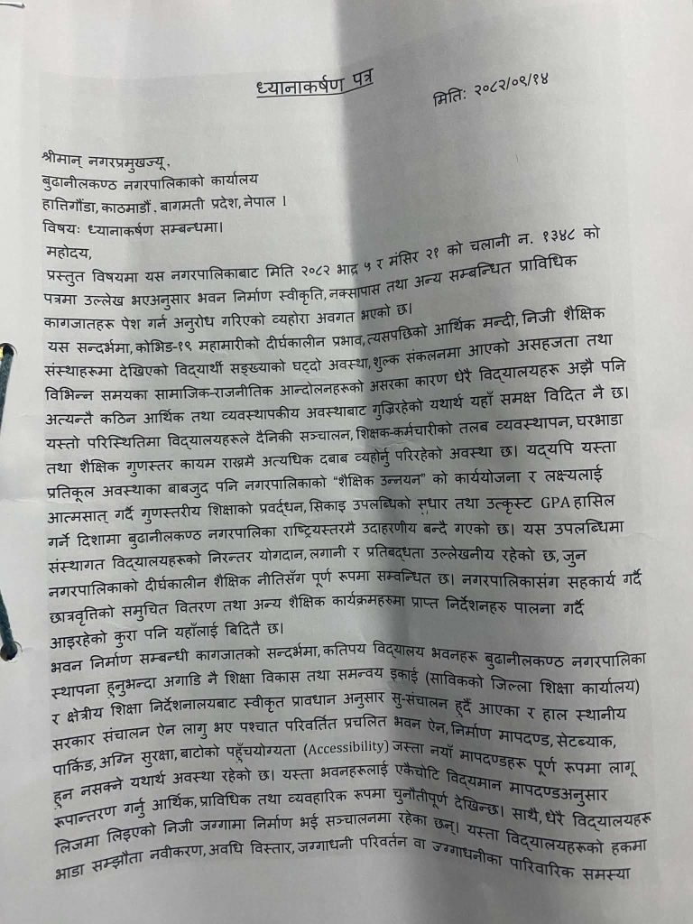 बुढानिलकण्ठ नगरपालिकालाई संस्थागत विद्यालयहरुको ध्यानाकर्षण !